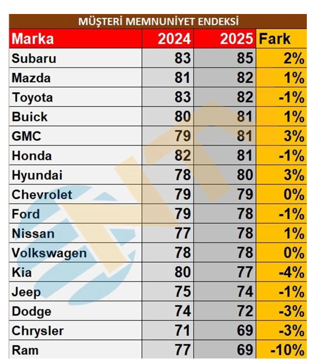 Araştırmaya göre Subaru, 85 puanla kullanıcı memnuniyetinde zirvede yer aldı. Onu 82 puanla Mazda ve Toyota takip etti. Buick, GMC ve Honda ise 81 puanla üçüncü sırayı paylaştı.
