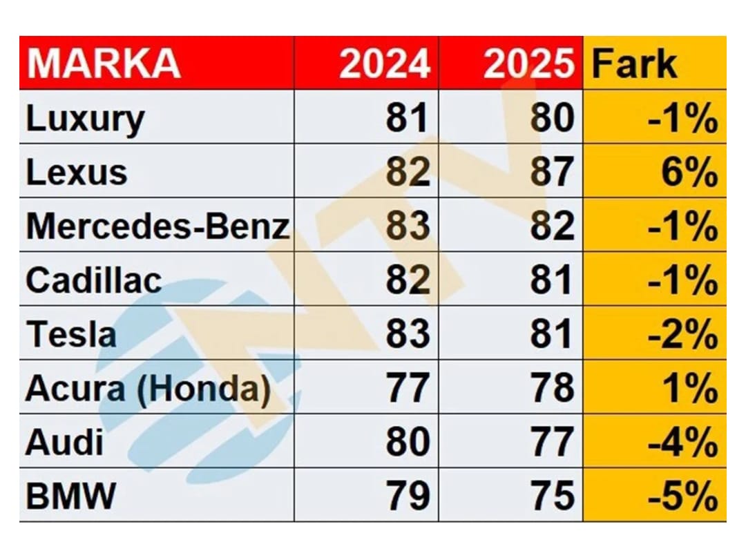 Lüks otomobil segmentinde Lexus, 87 puanla açık ara birinciliğe yerleşti. İkinci sırada 82 puanla Mercedes yer alırken, Cadillac ve Tesla ise 81 puanla üçüncülüğü paylaştı. Geçtiğimiz yıla göre 4 puan kaybeden BMW, 75 puanla lüks segmentin en az memnuniyet yaratan markası oldu.