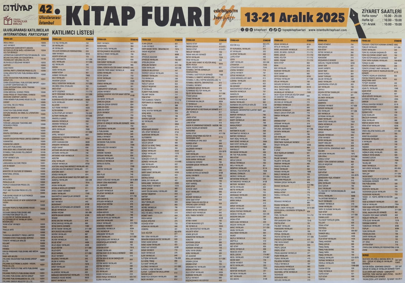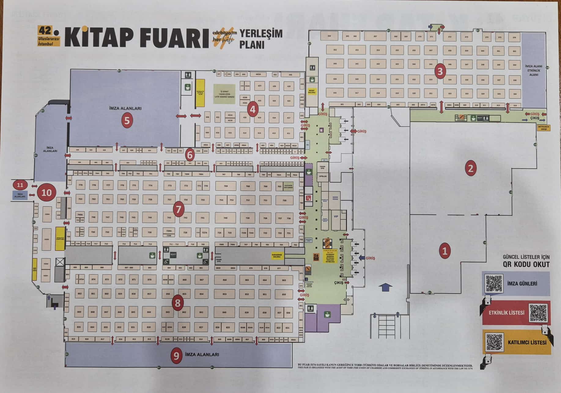 Fuarın yerleşim planı, ziyaretçilere kolay navigasyon sağlıyor: Girişler numaralandırılmış kapılardan yapılırken, imza alanları ve etkinlik salonları harita üzerinde net bir şekilde işaretlenmiş. Güncel katılımcı listesi, etkinlik programı ve imza günleri için QR kodlar fuar alanında ve broşürlerde yer alıyor. Detaylı bilgi için resmi site www.istanbulkitapfuari.com ziyaret edilebilir.