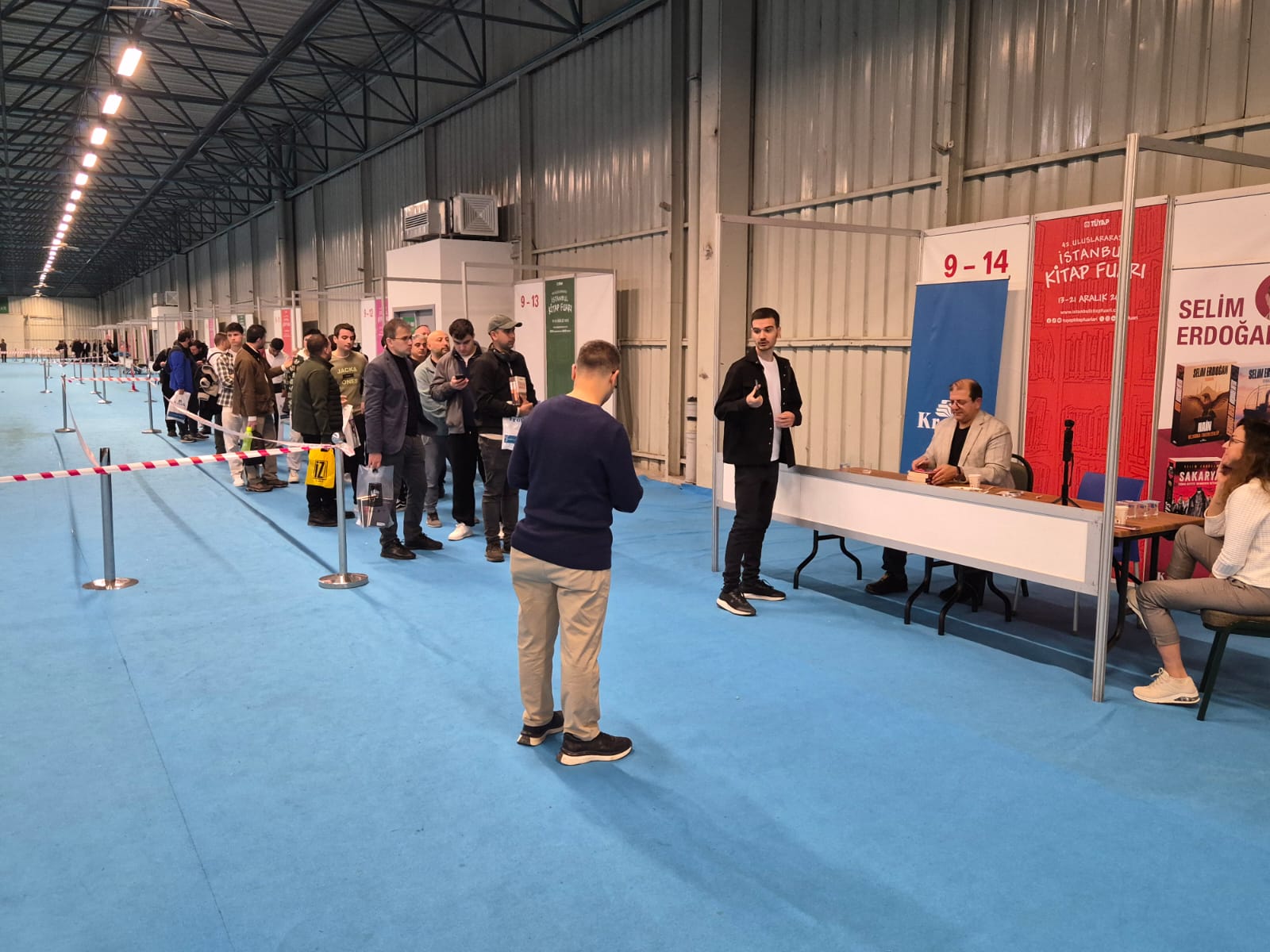 Kronik Yayınevi’nin standında genç yazar Selim Erdoğan, yaklaşık 35-40 kişilik bir kuyruk oluşturarak hayranlarıyla buluşuyor ve imza dağıtmaya devam ediyor.