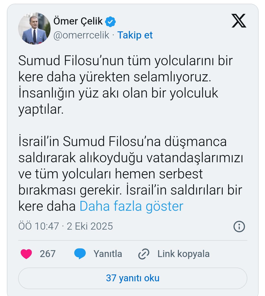 Çelik açıklamasında, “Sumud Filosu’nun tüm yolcularını bir kere daha yürekten selamlıyoruz. İnsanlığın yüz akı olan bir yolculuk yaptılar. İsrail’in Sumud Filosu’na düşmanca saldırarak alıkoyduğu vatandaşlarımızı ve tüm yolcuları hemen serbest bırakması gerekir” ifadelerine yer verdi.