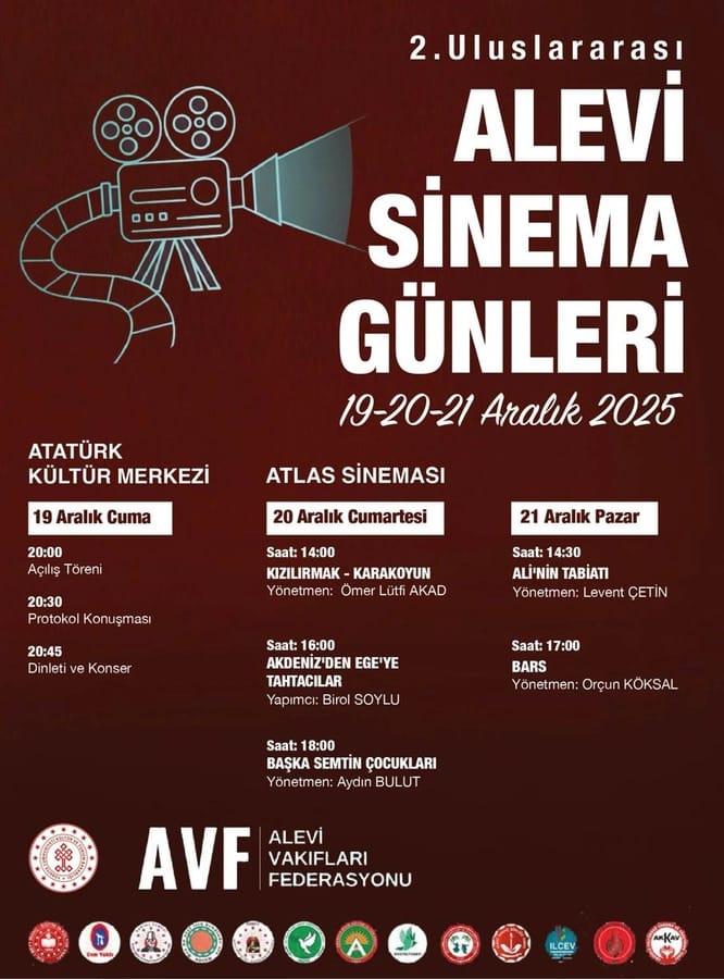 Alevi Vakıfları Federasyonu (AVF) tarafından bu yıl ikincisi düzenlenen Uluslararası Alevi Sinema Günleri, 19–21 Aralık 2025 tarihlerinde Atlas Sineması’nda sinemaseverlerle buluşuyor.