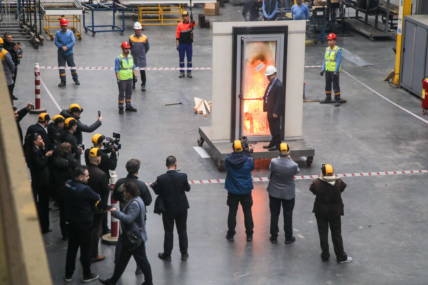 Çuhadaroğlu Alüminyum fabrikasında gerçekleştirilen toplantıda kapıların yangına dayanıklılığı uygulamalı olarak gösterildi. Yüzlerce dereceye ulaşan alevlerin karşısında basınla bir araya gelen Çuhadaroğlu Yönetim Kurulu Başkanı Nejat Çuhadaroğlu, yangın güvenliğinin teknik bir detay değil, doğrudan insan hayatıyla ilgili olduğunu vurgulayarak çarpıcı uyarılarda bulundu.