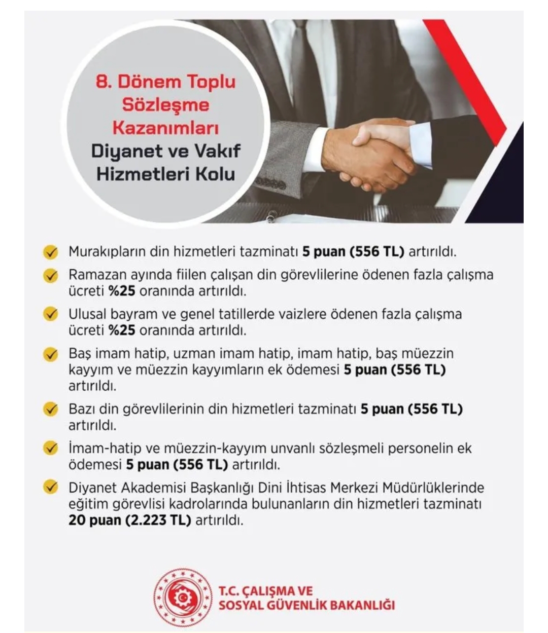 Çalışma ve Sosyal Güvenlik Bakanlığı, toplu sözleşme süreci kapsamında 11 hizmet koluna dair yeni mali ve sosyal hakları duyurdu. İşte bazı önemli başlıklar: