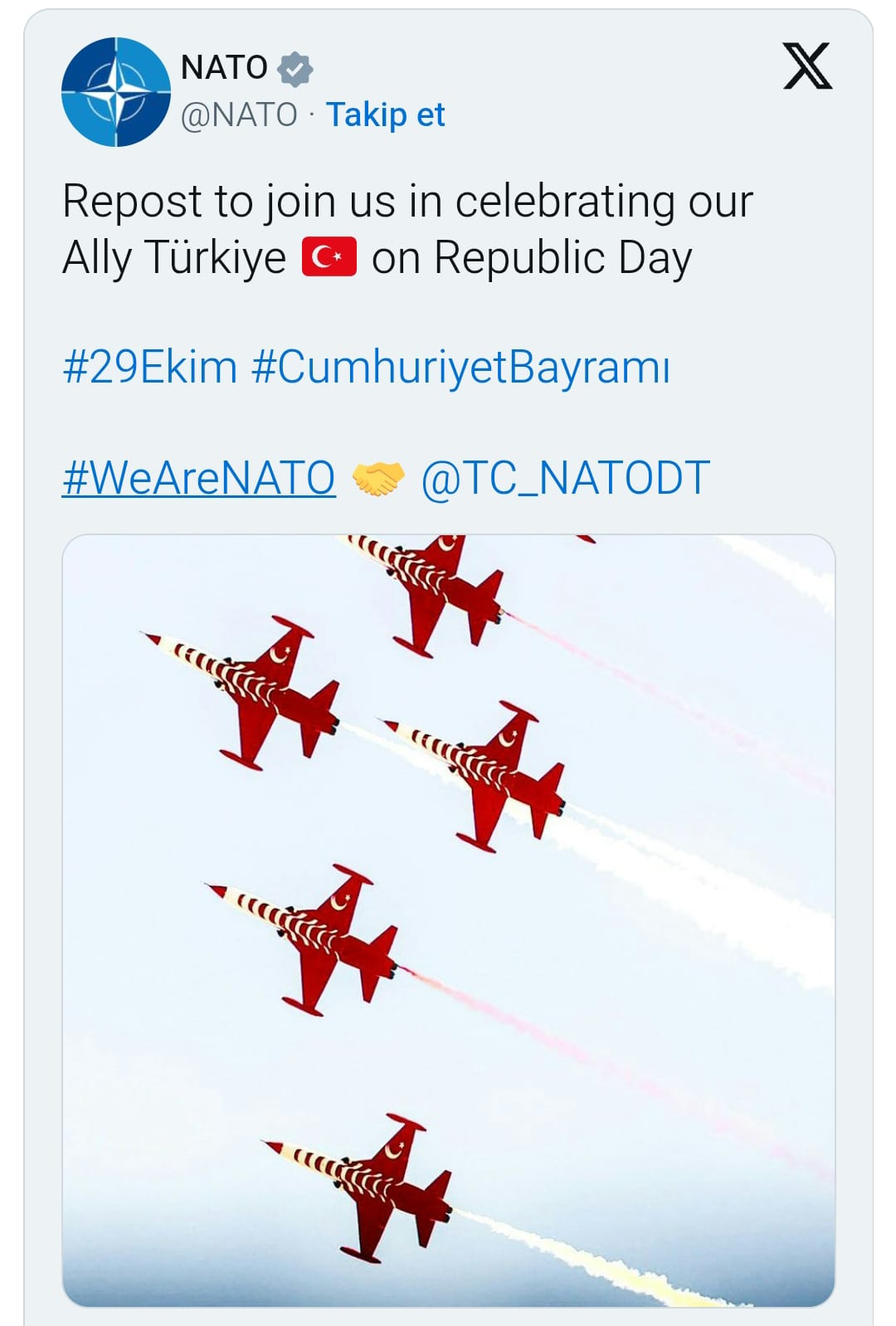 NATO’nun resmi X hesabından yapılan paylaşımda, kullanıcılar Cumhuriyet Bayramı’nı kutlamaya davet edildi. Gönderide, “Müttefikimiz Türkiye’nin Cumhuriyet Bayramı’nı kutlamamıza katılmak için (bu gönderiyi) yeniden paylaşın” ifadesine yer verildi.