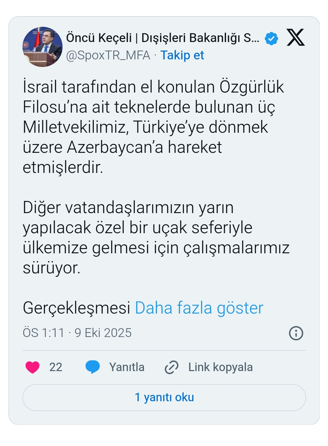 > “İsrail tarafından el konulan Özgürlük Filosu’na ait teknelerde bulunan üç milletvekilimiz, Türkiye’ye dönmek üzere Azerbaycan’a hareket etmişlerdir. Diğer vatandaşlarımızın yarın yapılacak özel bir uçak seferiyle ülkemize gelmesi için çalışmalarımız sürüyor. Gerçekleşmesi halinde, söz konusu seferle üçüncü ülke vatandaşlarını da tahliye etmeyi öngörüyoruz.”